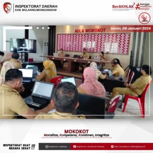 BOLMONG – Inspektorat Daerah Bolaang Mongondow menggelar rapat evaluasi capaian kinerja pengawasan tahun 2023, Senin (8/1) kemarin. Rapat evaluasi yang digelar di Aula Mokokot Kantor Inspektorat Bolmong itu sendiri dipimpin langsung Kepala Inspektorat Daerah Bolmong, Rio Lombone.
