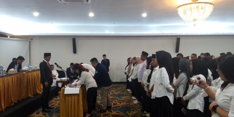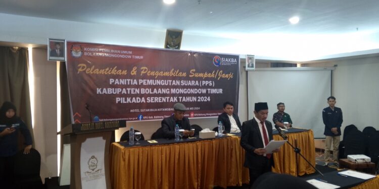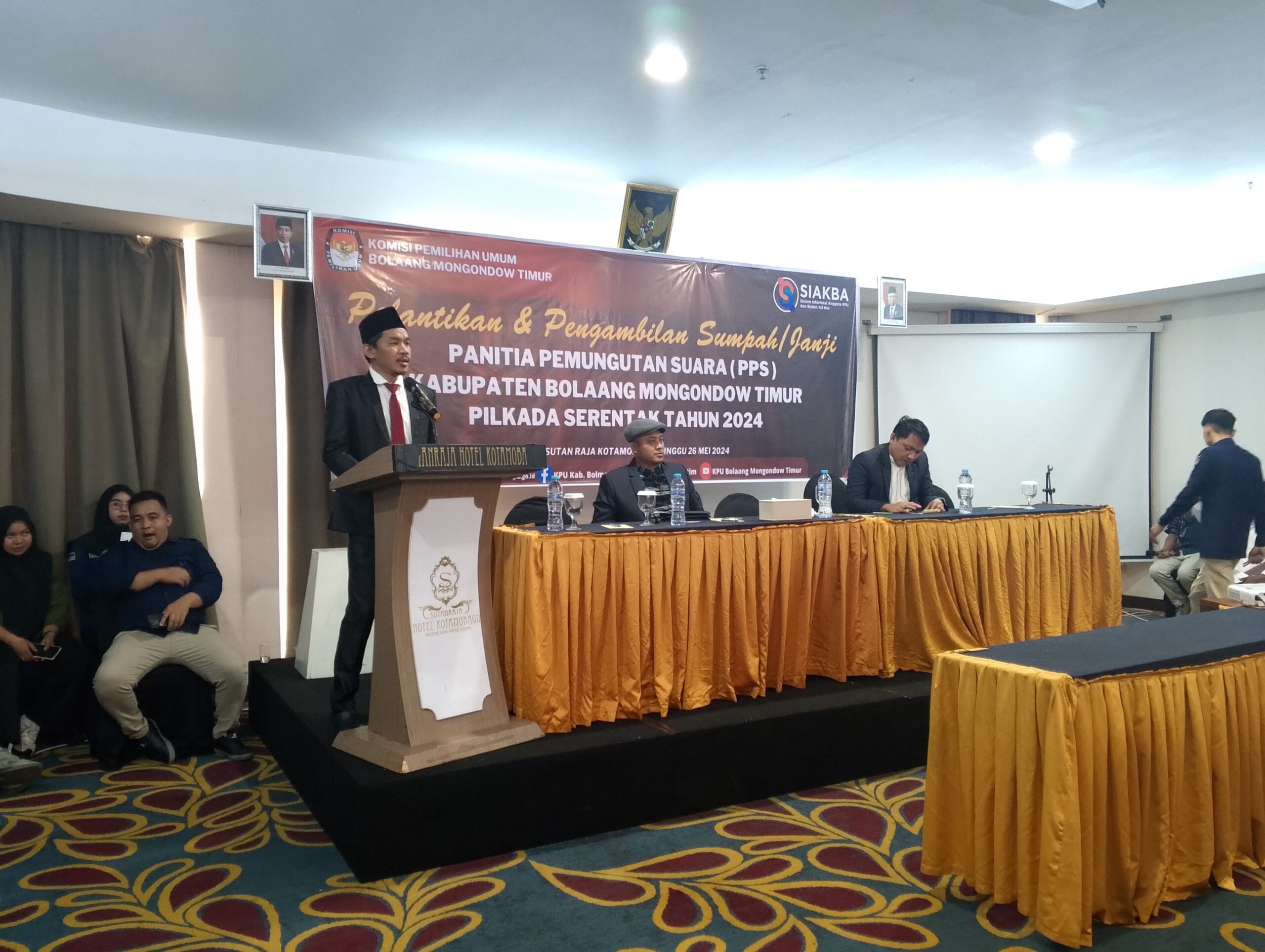 Erastori, Boltim – Komisi Pemilihan Umum ( KPU) Kabupaten Bolaang Mongondow Timur ( Boltim), resmi melantik serta pengambilan sumpah/janji kepada Panitia Pemungutan Suara (PPS) di hotel Sutan Raja pada Minggu, 26 mei 2024.