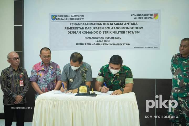 Kodim 1303/BM diwakili oleh Dandim 1303/BM Letkol Inf. Fahmil Harris, SIP., dan Pj Bupati dr. Jusnan C. Mokoginta, MARS., mewakili Pemerintah Kabupaten Bolaang Mongondow menandatangani Perjanjian Kerjasama antara Pemerintah Kabupaten Bolaang Mongondow dan Komando Distrik Militer 1303/Bolaang Mongondow tentang Pembagunan Rumah Baru Layak Huni untuk Kemiskinan Ekstrim.