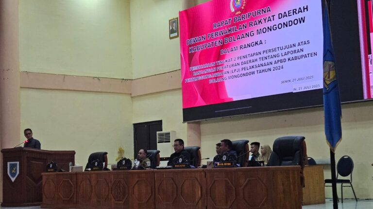 BOLMONG — Dewan Perwakilan Rakyat Daerah (DPRD) Kabupaten Bolaang Mongondow (Bolmong) menggelar rapat paripurna pembicaraan tingkat II atas Rancangan Peraturan Daerah (Ranperda) dan Laporan Pertanggungjawaban (LPJ) APBD tahun anggaran 2024, Senin (21/7/2025).